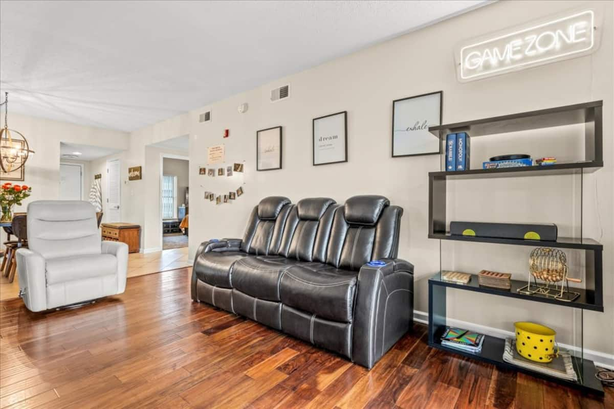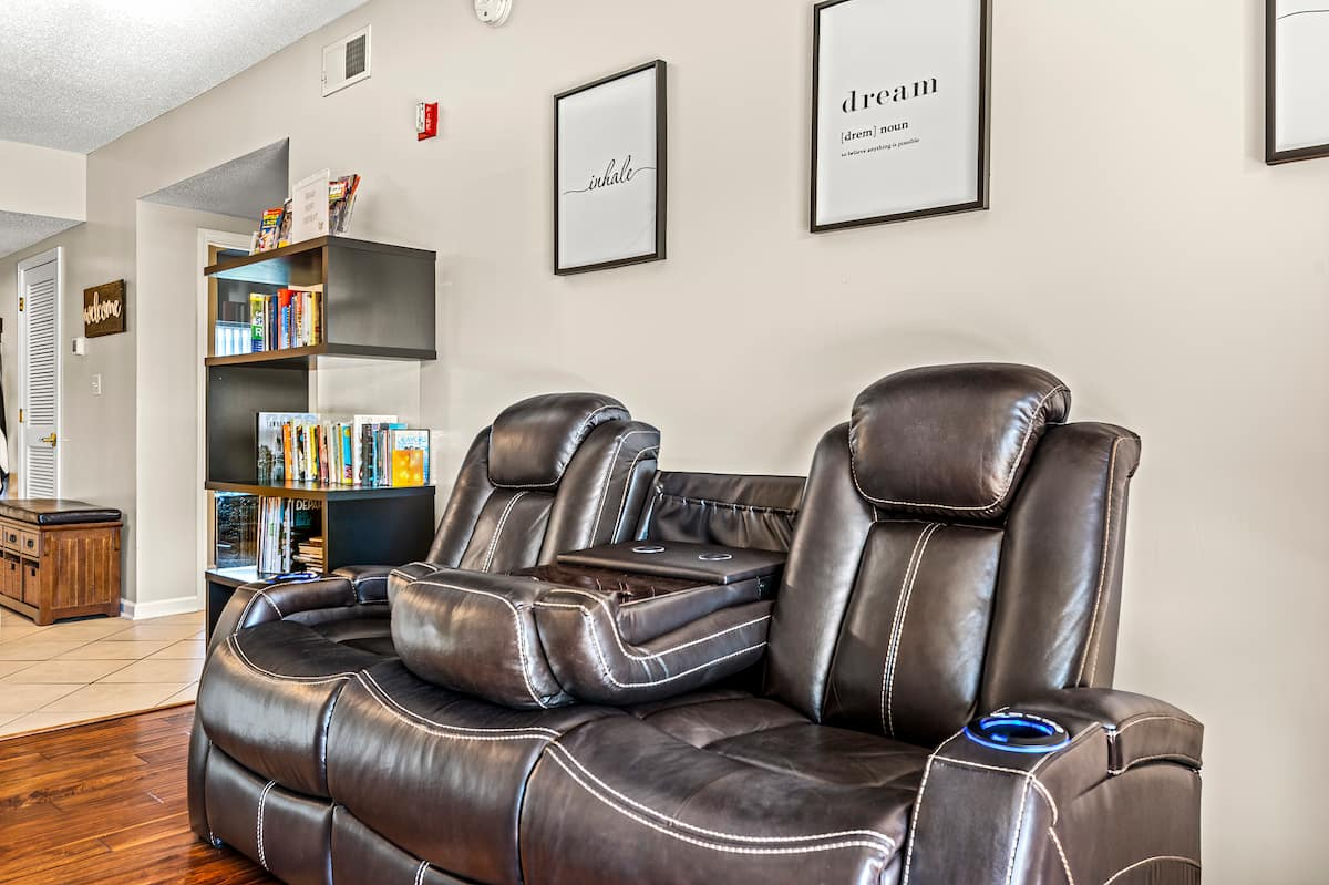 ✓ Living room with theater-style seating, 55″ Smart TV, and fireplace
